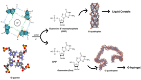 Questa linea di ricerca è incentrata sullo studio di un sistema di G-quadruplexes formati da miscele di guanosina (GMP) e guanina (Gua), una molecola con la stessa base azotata della GMP. Le strutture elicoidali che si auto-assemblano tramite il meccanismo di π-stacking interagiscono in modo mediamente più attrattivo rispetto alle strutture formate da campioni contenenti soltanto GMP, in quanto le molecole Gua sono prive di carica. La presenza di stabili interazioni elica-elica porta quindi alla formazione di un idrogel fisico, con una complessa architettura supramolecolare.