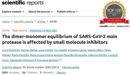 49. Silvestrini, L., Belhaj, N., Comez, L., Gerelli, Y., Lauria, A., Libera, V., Mariani, P., Marzullo, P., Ortore, M.G., Palumbo Piccionello, A., Petrillo, C., Savini, L., Paciaroni, A., Spinozzi, F. The dimer-monomer equilibrium of SARS-CoV-2 main protease is affected by small molecule inhibitors (2021) Scientific Reports, 11 (1), 9283, https://doi.org/10.1038/s41598-021-88630-9 OPEN ACCESS